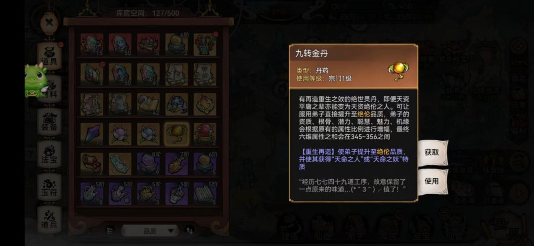 一、系统任务 系统送的有剑修韩飞羽、兵家杨安、医师林清瑶、书生西门宇、医师白子灵(男)。韩飞羽初始橙色,在后面的活动中有可加属性点的丹药,基础属性点到365时可以进阶到红色逆天资质。吃属性点要慎重,优秀的天命和灵根弟子亦可这样操作。 九转金丹:有再造重生之效的绝世灵丹,即便天资平庸之辈亦能变为天资绝伦之人。可让去服用弟子直接提升至绝伦品质,弟子的机缘资质、根骨、潜力、聪慧、魅力,机缘,会根据原有的