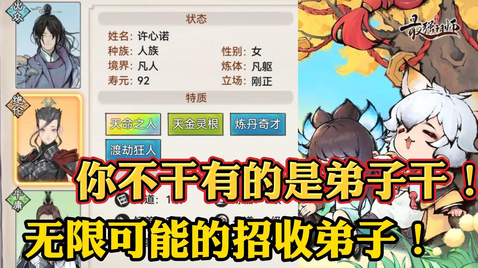 #最强祖师金蛇贺岁创作征集令 #游戏推荐 #游戏讨论 #游戏资讯 #攻略 #最强祖师 游戏主要是收集弟子,他们的品质分别为平庸、出众、傲人、绝伦、逆天 。绝伦品质以上品质弟子才会“天命之人”。 在弟子的六维属性中,潜力最重要,很影响弟子的战力。 有一些小细节:将弟子任命掌门后再去吃,收益最大化。通过炼丹大会是获取丹药。后山禁地可以刷天赋特质,但不稳定。九转金丹后期会有很多,但前期比较缺。可以注意