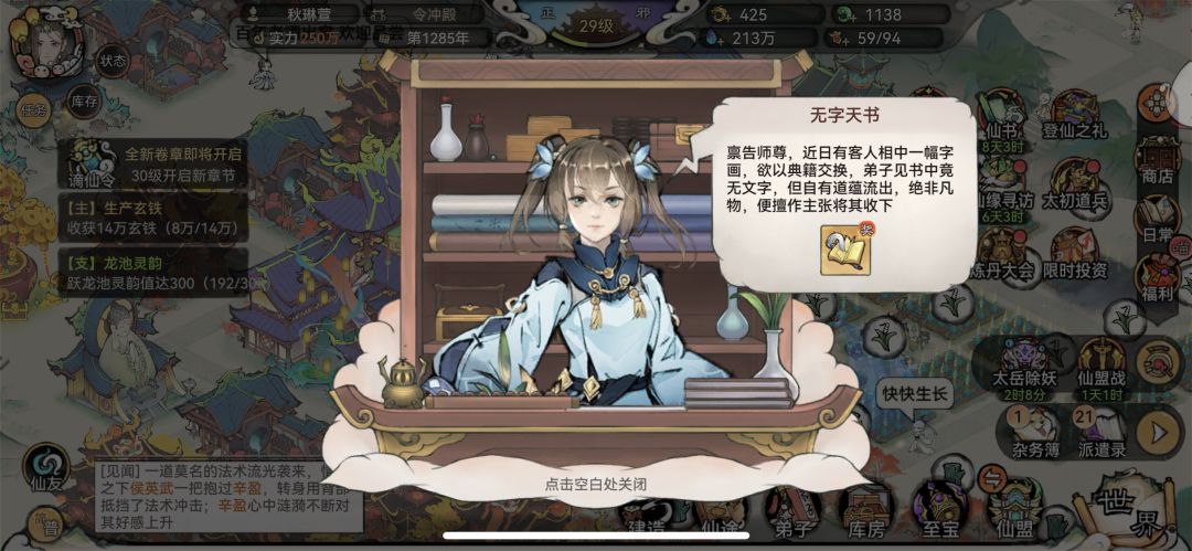 讲一些可能有些大家知道,有些大家又不知道的攻略细节,助力玩家更上一层楼。主要是一些不额外氪金的细节上,开局刷3个名望家族就不用提了吧。前期快点升等级总是对的 一,弟子专研技能以后,会增加属性,每个弟子可以携带10个技能,带上就可以吃这些属性加成,不用上场也有加成,一定要让弟子学满技能10个,细节方面就是你的无字天书蓝色紫色,可以考虑往一个适合你自己的某元素技能怼,比如他只加攻击,你就优先升他们,提