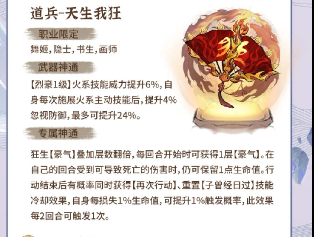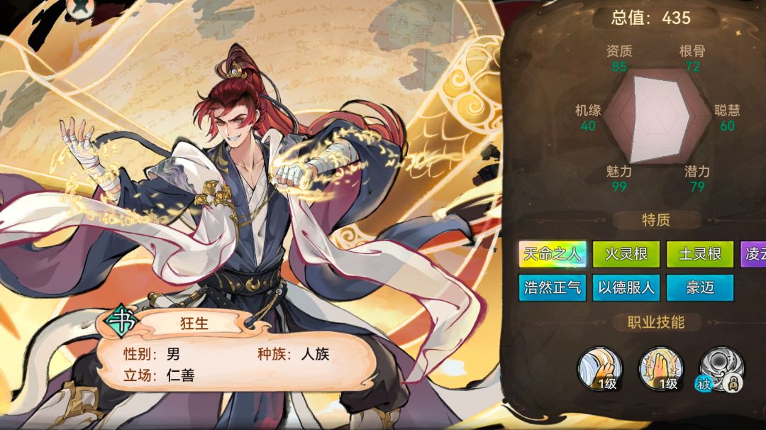 #狂生攻略 狂生是人族弟子,拥有火灵根与土灵根,以火灵根主打输出,土灵根辅助 。天赋上,“浩然正气”让他效果抵抗+10%,面对控制技能更从容;“豪迈”提升魅力与渡劫成功率,助其社交与修行“以德服人”增加法术伤害 ,契合输出定位。体质“凌云之躯”加效果命中与火系功法威力,还降低火系伤害,在火系战斗中优势明显 技能运用 普通攻击:对单个敌人造成160%法术攻击伤害,看似普通,却能触发