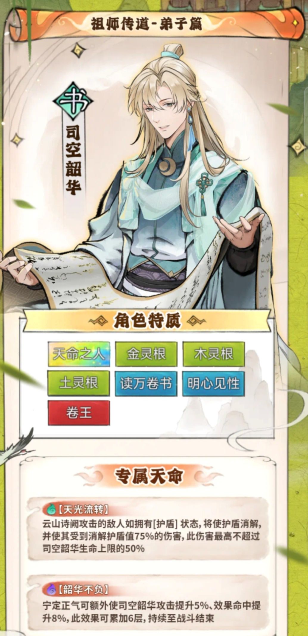 #最强祖师攻略 祖师的小伙伴们好,卿卿今天带来一篇萌新弟子养成攻略。有这样一个弟子,如果对面厚厚的盾就等着遭殃吧,他不管是定位输出还是辅助都能够驾驭的了,他是一届书生,自然腹有诗书气自华。这个弟子就是破盾能手司空韶华。 一、司空天命分析 1.【天光流转】 云山诗阙攻击的敌人如拥有【护盾】状态,将使护盾消解,并使其受到消解护盾值75%的伤害,此伤害最高不超过司空韶华生命上限的70%。 司空施这破盾技