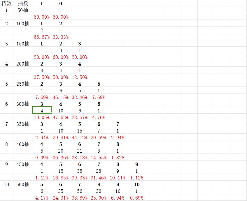 再续前文,在上一篇我已经毙掉的是不是欧皇一文中,我错误地把这个抽奖求二项分布的概率,幸亏有两位评论区大佬说这并不是二项分布,而是相关事件,建议用二叉树。 通过我对前几次抽奖的总数分析,发现这竟然是一个斐波那契额数列,斐波那契额数列即是每一项等于前两项的和,如:1,1,2,3,5… 然后我继续思考为什么是斐波那契数列,然后,让我找到了规律:因为每一档抽到n个心愿的次数等于前两档抽到(n-1)个心愿的