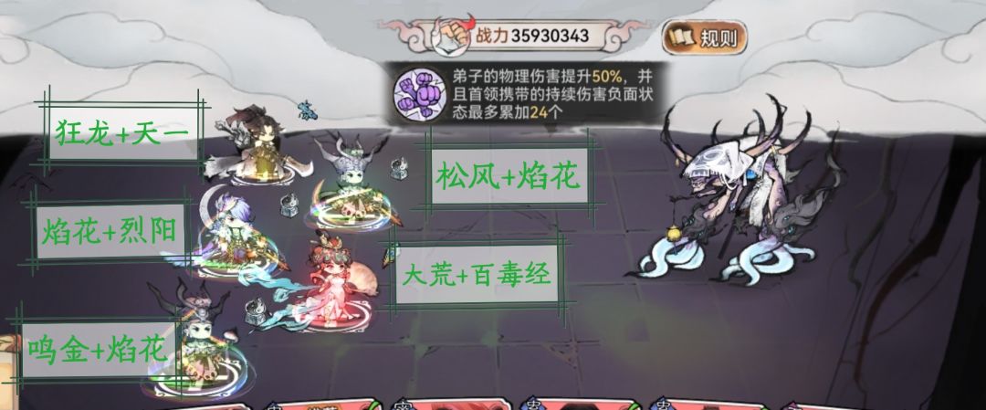 阵容功法如图(卫寒不是唯一,根据自己练度可选择老李韩立龙人等,后排可根据情况把鸣金蛊替换练度高的c位),伏妖试炼由于有持续伤害的限制,蛊修的发挥被限制了,不过仍然能打出不俗的伤害。 法宝:唐带羽毛,其他所有位置带适配的无常印。 思路:利用抗伤位松风辅助蛊冷却给后排减技能cd,虽然持续伤害数量被限制了,但是搭配无常印仍能打出可观的伤害