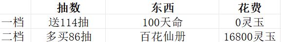 奥运会结束了,可以写写攻略了 最强祖师迎来半周年庆,福利不大,慢慢白嫖呗! 探宝令 签到:60抽 藏宝图:40抽 每日免费:7抽+7抽 送的:60+40+7+7=114抽 灵玉礼包 300灵玉:2抽 720灵玉:4抽 1600灵玉:8抽 3000灵玉:12抽 买的:2+4*3+8*9=86抽 花费:300+720*3+1600*9=2460+14400=16800灵玉 想拿新功法(百花仙册)的兄弟