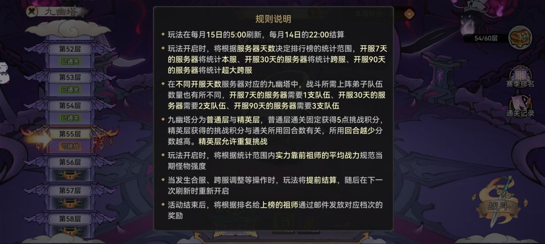 先给只在一个区玩的朋友们科普一下——九幽塔的难度是根据排名前几的玩家平均战力决定的,而不是每个区都一样,也就是说你们区大佬越厉害,你遇到的怪就越厉害。你们区人越少越咸鱼,你就能把奖励拿光。 1,九幽塔难度按照平均战力设置吃相过于难看。这一点老区新区双修玩家特别清楚,越老的区10万氪甚至不如新区玩家的1万氪度的体验,氪的比新区多,资源拿的比新区还少。至今不清楚为何就不能多设计几关奖励,战力越高多设置