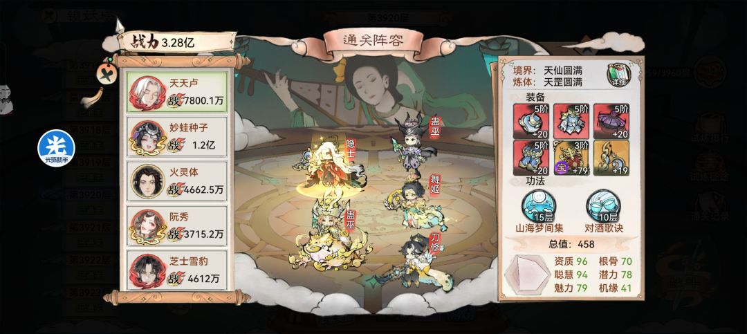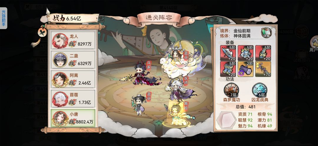为什么说是平民攻略,因为我没买道兵, 我抽了十三娘到红一,测试他无数次 最终发现他强大之处(反击辅助位) 首先他纯输出是真的不如韩立,龙人,天土 但他是一速的克星,没错(快攻的克星) 法宝:带500蓄力值的,如图功法是我带的 技能:金刚密经(超级推荐)命中加成高情况下 主动:使用直接清除敌方大量BUF 被动:挨打直接给对方套上一回合禁止增益 等于画师在用技能 特别是大招一开锁血情况下,你打我我