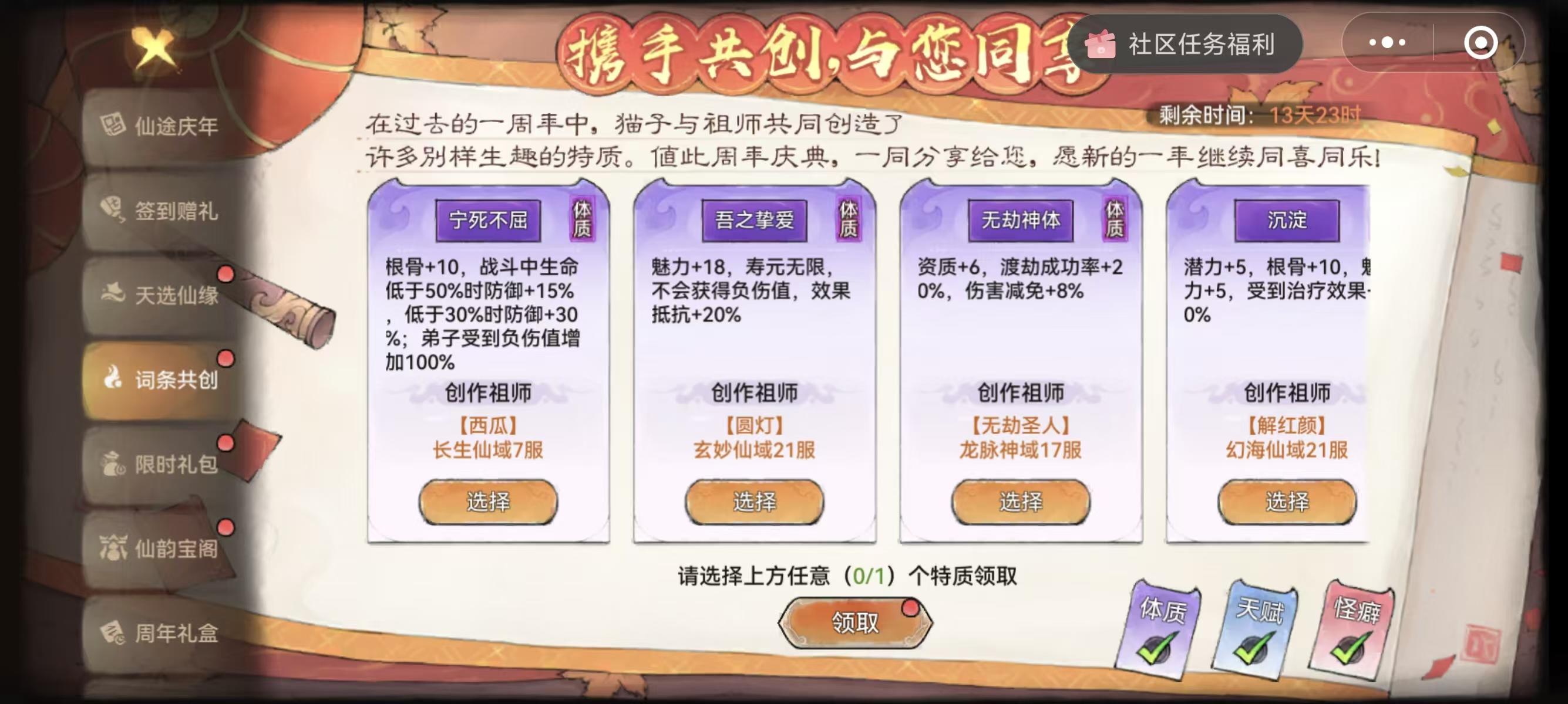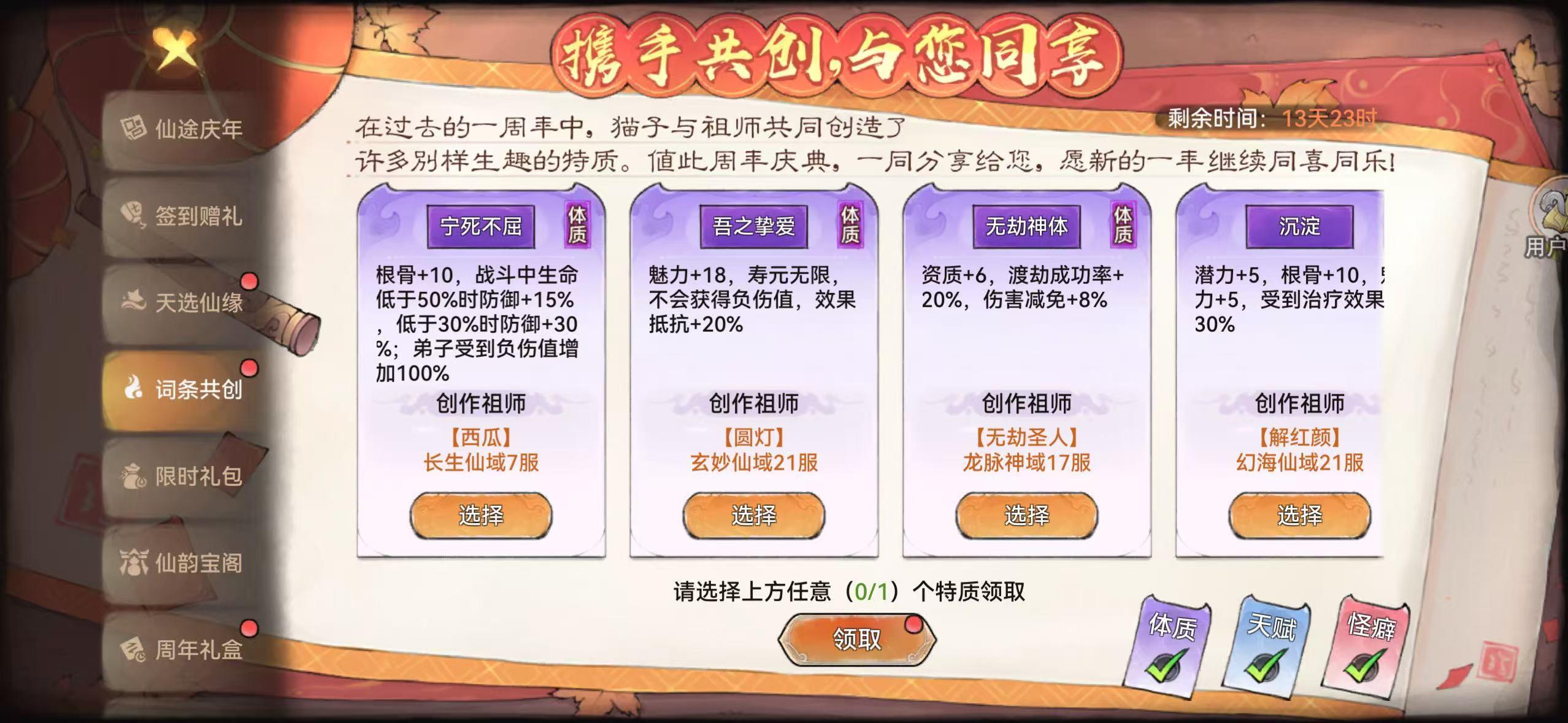 其实关于联动,现在越来越敷衍。最早我刚刚玩游戏时候,是龙虎山联动,主要讲了穿越和龙虎山的一些趣味科普。加入了龙虎道丹的设定,那可以说是最诚意的活动了,龙虎道丹效果为100潜力以下,+1潜力。后续的凡人修仙其实也没有什么好说的,但是去年开始都是买一些不值钱的老ip,什么大话西游,包括今年的倩女幽魂。现在倒好别说这些ip了,直接给你搬上了卡皮巴拉。首先我想请问下,玩家玩这个游戏,是为了修仙养一只