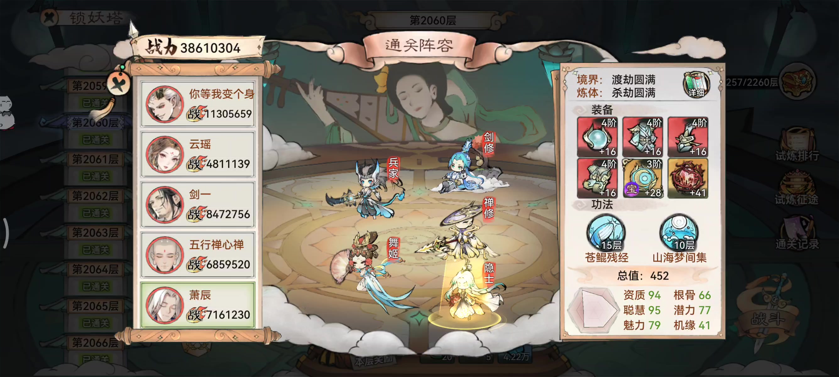 推荐原因: 五行禅抗住了第一回合的伤害,成功拉起队友展开反击吧 大致过程: 第一回合,老老陈大佬的韩立直接一键三连清场梦中人,梦中人仅有五行禅靠无敌存活下来了,还有一定的运气成分。然后五行禅直接一手山海拉起所有队友,并且通过地藏赋予了1回合无敌。 第二回合,老老陈大佬的韩立依旧先手但是由于梦中人全员无敌直接抗住这波伤害,然后龙人天一干掉2人,打出秦冰复活,卫寒接上囚龙拿下秦冰,再触发命途拿下龙人 游