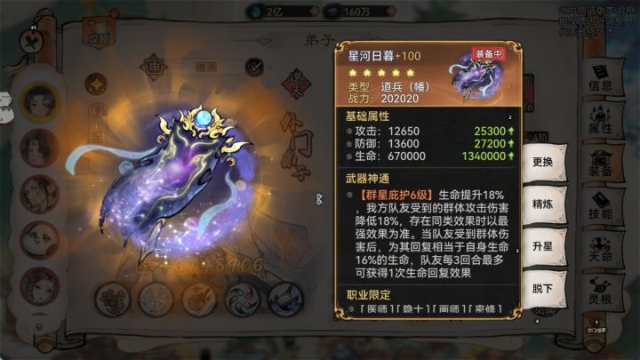 本次为大家带来的是道兵星河日暮和月落孤影相关测评。首先出场的是:星河日暮星河日暮道兵类别:幡适用职业:医、隐、画、密、蛊。综合评价:☆☆☆☆星河日暮能够有效的提升队伍整体生存率。由于道兵效果是群体伤害降低和根据自身生命百分比回血,且被动提升生命上限。所以这把道兵理论上更适合生命成长更高的职业携带。比如密和隐。
