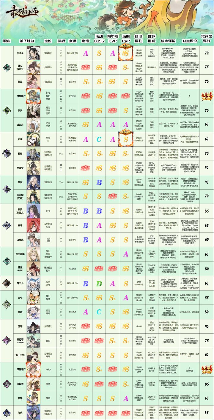 仅代表个人观点,给新入坑的小白们提前做个弟子能力范畴的参考,游戏后期阵容搭配比较多,很多弟子没有固定的强弱。这个表的推荐评分主要考虑的是在后期仙界PVP中,主流强势阵容下弟子表现情况。因为分级比较多,用不同颜色区分,大概表述一下分级:红色(SSS):遥遥领先;黄色(S-SS):有就业空间,强弱有别但未达到断档程度;紫色及以下:跟不上节奏;