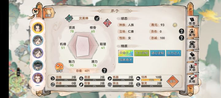 首先作为一个萌新,肯定会招募到各种各样的弟子,剑修呀,兵呀,医生等等,不过要如何选择一个好的剑修呢。首先,我们需要看一个剑修的灵根,作为一个天命的剑修,我们一定要选择带有天火灵根的剑修,如果没有天火,那可以先用普通的火灵根用着。只有天火才是毕业答案其次呢,我们当然要看他的天赋和怪癖了,天赋就是灵根后面蓝色的小框框,怪癖就是红色的小框框,比如剑心,自大,胆小,急性子这些就是非常好的,如果你的剑修