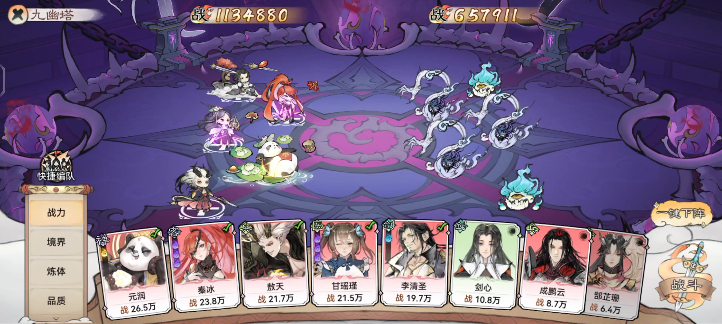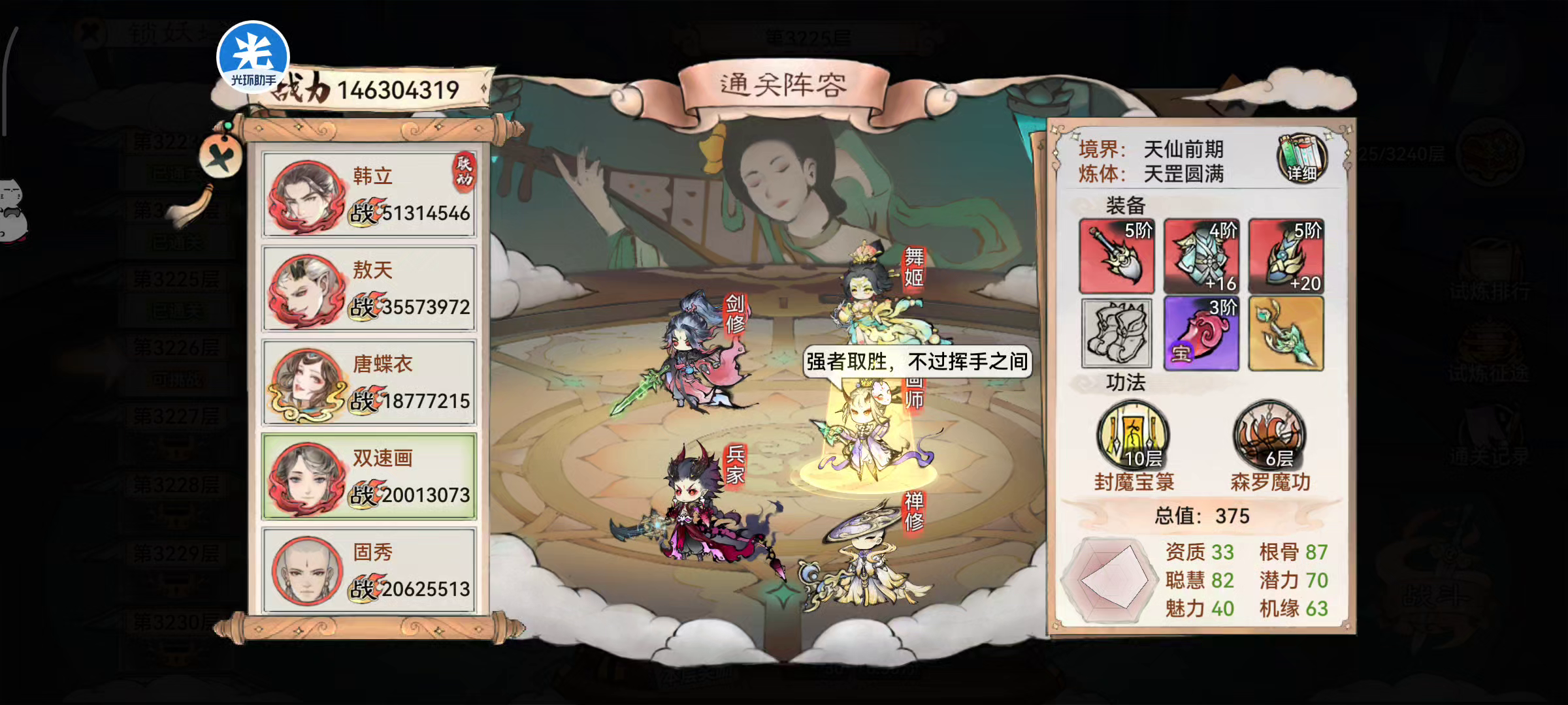 这关主要是封技,所以带森罗魔攻和封魔宝录来打,画师和舞姬都要200效果命中以上,一个一速,一个尾速,仅供参考#最强祖师爬塔 审核给我过
