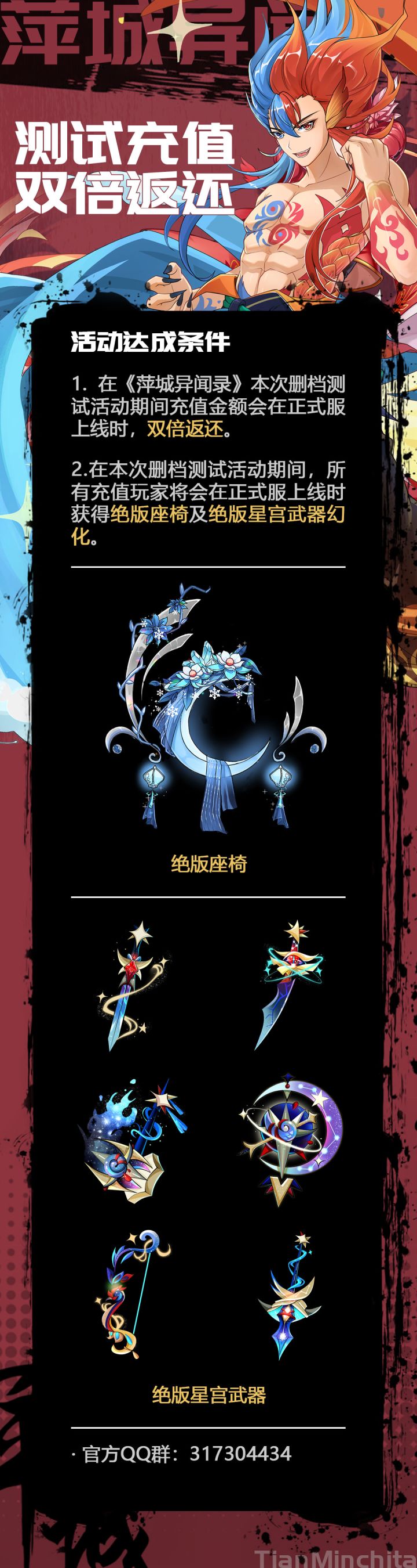 萍城异闻录“兔年迎新”测试圆满结束~感谢每一位参加的玩家,这个兔年能与大家共度,制作组感到无比荣幸!同时我们将开始公示春节期间,Tap论坛加上官方玩家群的活动中中奖的锦鲤名单~目前已经开始陆续发放奖励,预计将于2023年2月20日之前发放完毕。这期间如果一直苦苦没有等到官方联络的小锦鲤,也可以自己主动联系我们!官方Q群:317304434活动最终解释权归《萍城异闻录》制作组所有。同时