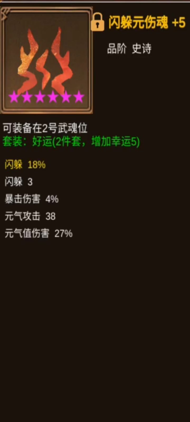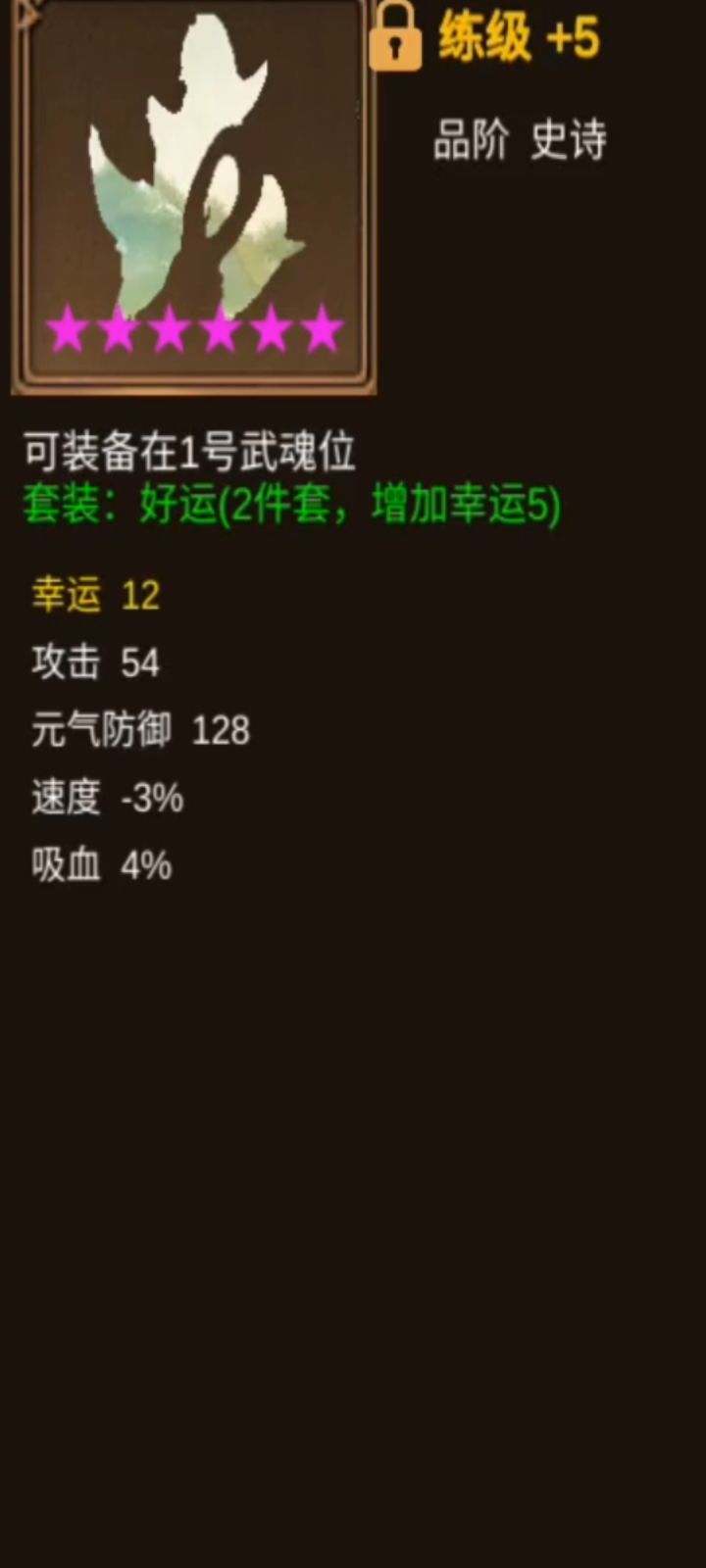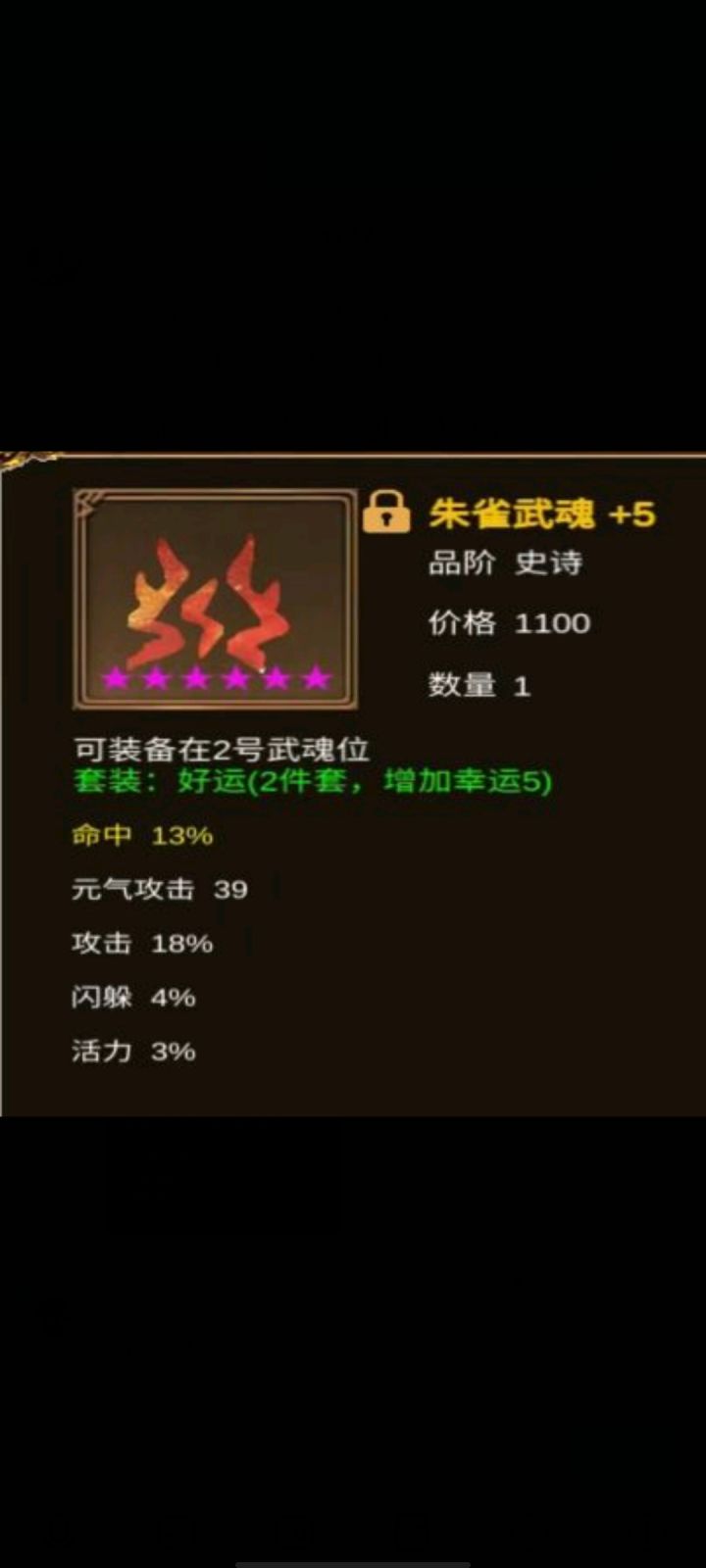 游戏玩了一年了,对游戏也有一定的了解了。推荐一套武魂搭配,其实武魂这个搭配怎么说呢,有千万套,俗话说的好,适合自己才是最重要的。话不多说进入正题给迷茫的人一点参考。拳头和斧头(活力套)青龙主元气百分比加副攻击百分比朱雀主闪躲加副元气百分比刀和枪(命中套)青龙主活力百分比加副攻击百分比朱雀主命中(闪躲)加副攻击百分比练功(幸运套)青龙双12,幸运12+12速度朱雀主命中