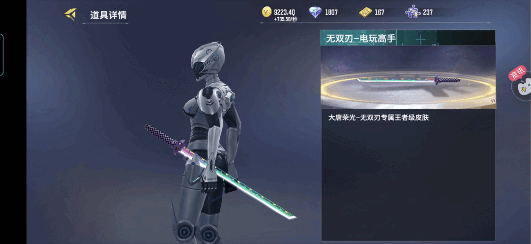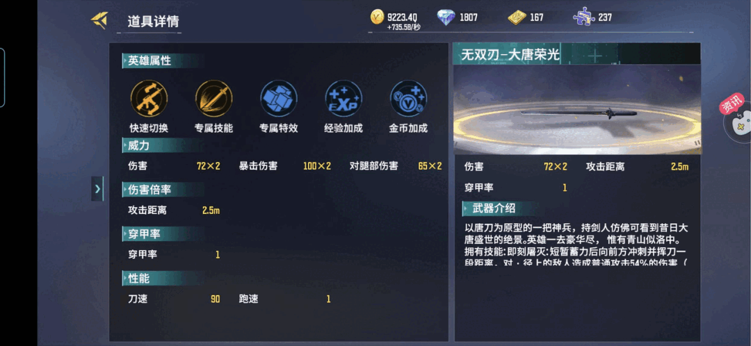 无双刃-大唐荣光测评闪亮登场!大家好呀,我是小阳。今天我会给大家讲解一把十分帅气的刀,同时这把武器也十分厉害的刀,这把刀也伴随着全民许多年了,属于是全民枪神里面一把元老级别的刀,是什么呢?那当然就是我们帅气的唐刀,那么本次我会给大家带来无双刃-大唐荣光的全面测评与讲解,希望对大家有所帮助,请随着小阳的步伐往下看吧↓1.外观数据讲解:(老武器系列)全民老武器,无双刃~大唐荣光测评闪亮登场①:面板