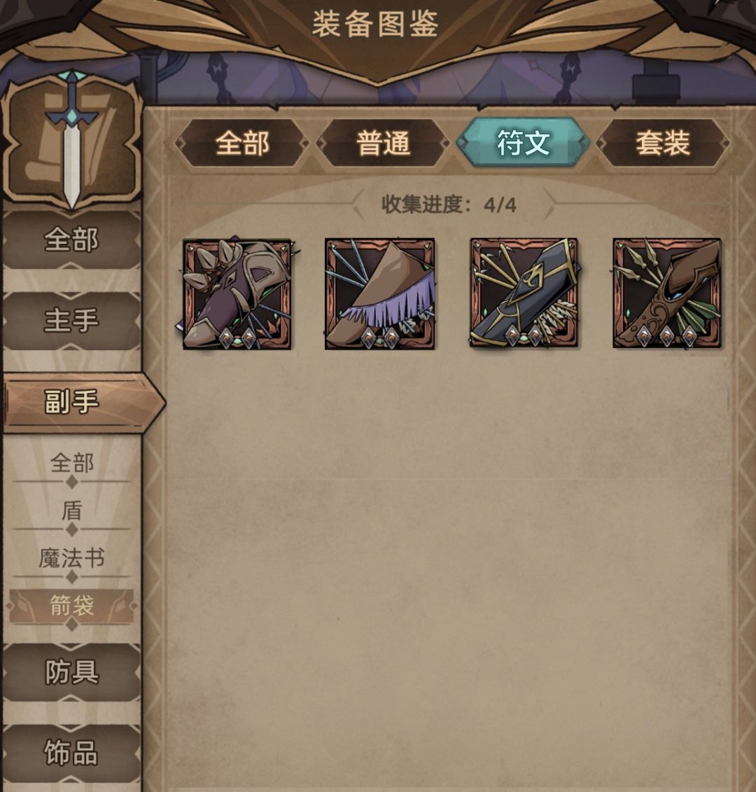 游侠装备图鉴-副手 本图鉴按【暗金】→【套装】→【符文之语】的顺序分类。 本系列图鉴中,左下方表示装备词条,右下方表示强化属性 更多图鉴内容,请前往 装备图鉴总目录 (一)暗金篇 截止到2023年5月27日,暗金副手共10个。 1. 秘银魔骨箭袋 掉落地点:魔界腹地-13; 关键词:装备主属性、攻击、生命值、穿透、元素穿透、固定减伤、全技能等级、追加普攻(条件触发)。 2. 红龙之