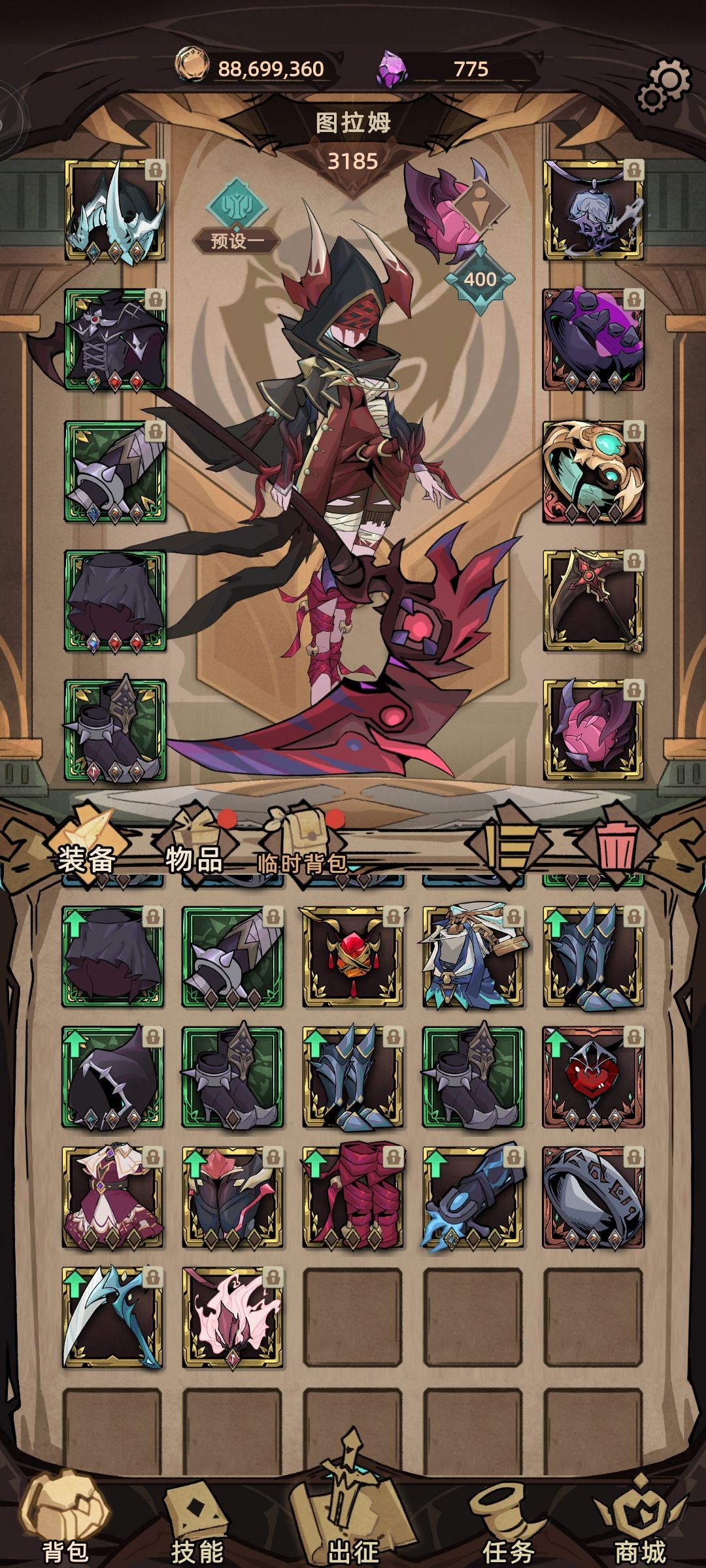 这里是磨难通关镇楼图 新职业魂术师是高伤害的小萝莉,推图刷塔都是一绝,装备强力,是萌新入坑的不二之选~ 接下来我们浅谈一下大家关心的转职问题~ 我玩的是死神和魔心双转职 死神长线强,推图快,魔心爆发高,秒BOSS 接下来是转职切换与装备概览 首先,武器方面我们选择浮华十字镰,为了被动双重普攻 魂器方面,我们采用保命的追魂索契,因为游玩的过程中发现魂术师很容易暴毙,而且伤害充足,所以我们选择保命装 头