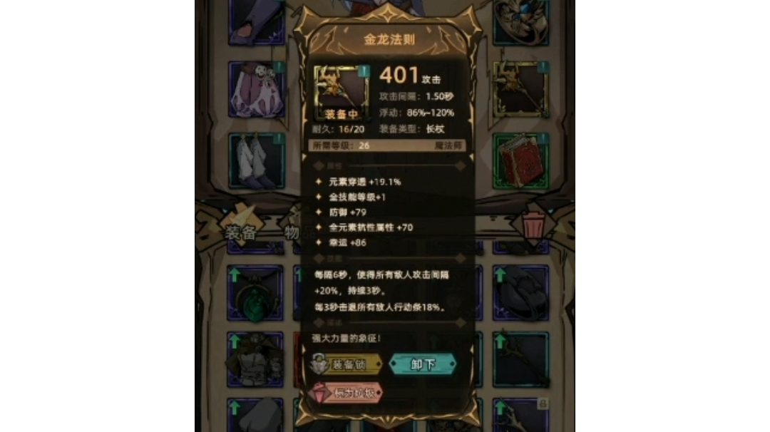 金龙法则的减攻击间隔被动配合土法的眩晕技能一起使用,可以让boss永久无法攻击。轻松实现越级强杀。