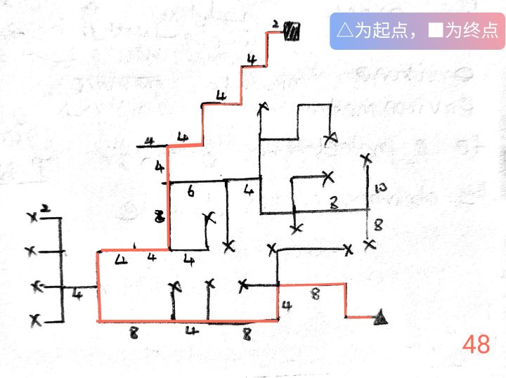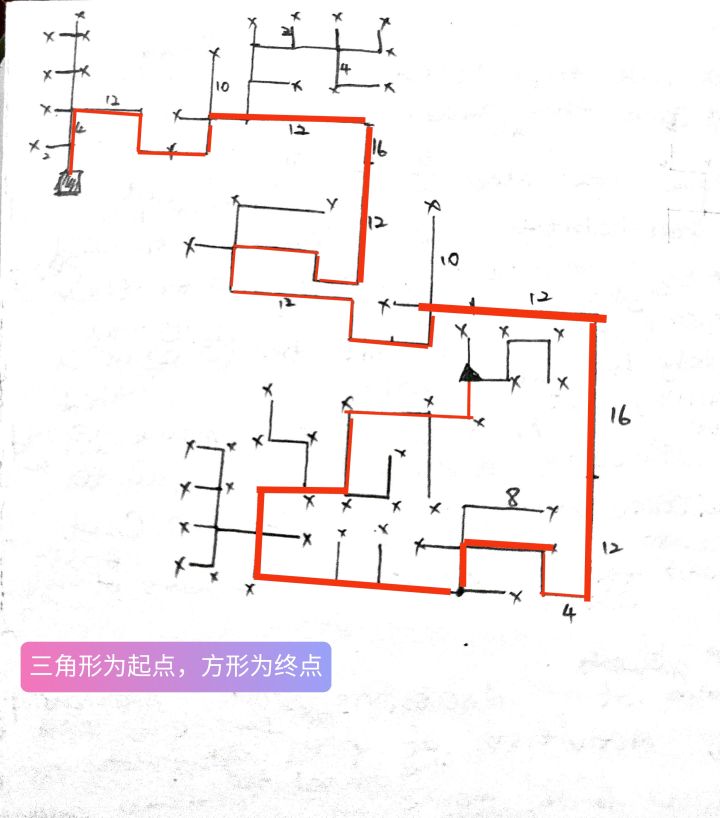 黑点是起始点,X代表死路○是分叉地,我在那块逛了半天,每一个岔路口都逛了一遍,都是死路啊!!!(有条线画错了,被划掉了)