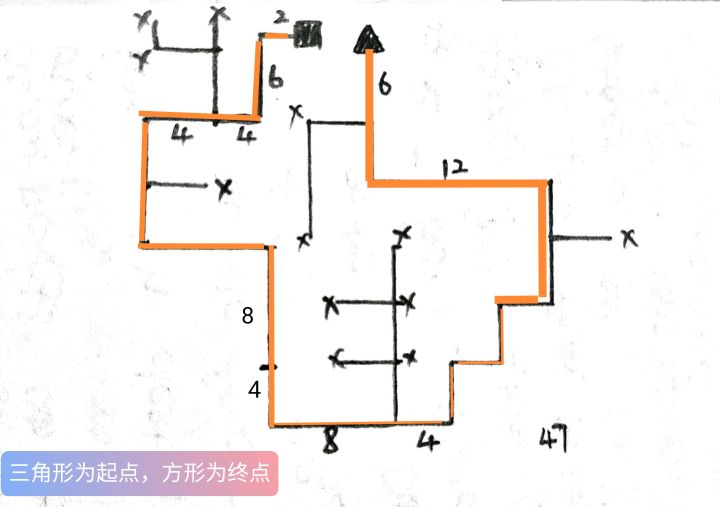 图示法上大分!因为是边走边画所以很潦草。(两组脚步声算一段,(一组是半段?每次莫名其妙通关以后就开始恐慌。△是起点,☆是终点游玩体验:刚开始很迷茫,因为不知道怎么样算是走了哪个方向,我以为需要一直拨动才会走,实际上向一个方向拨动一下就会一直走到墙或拐点。以及,在走动过程中最好不要改变方向,容易迷路。如果记忆力足够好,也可以尝试不画图。(每关走路的声音是单一的,并不会根据离终点的远近变化,