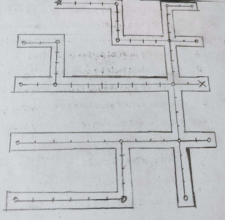 黑点是起始点,X代表死路○是分叉地,我在那块逛了半天,每一个岔路口都逛了一遍,都是死路啊!!!(有条线画错了,被划掉了)