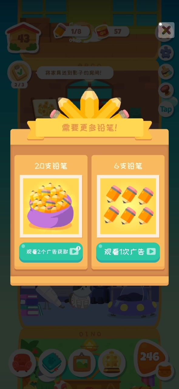 之前在别人评论看到切后台看广告的方法,个人试了很好用,关于7月多官方移除而两次广告我为什么还有,(今天刚看进论坛看见的)我也不知道,以前下过,又删了,这个月内又下了,就是两次的版本,我觉得挺好的,看两次还多八个铅笔呢[表情_猫咪举手]