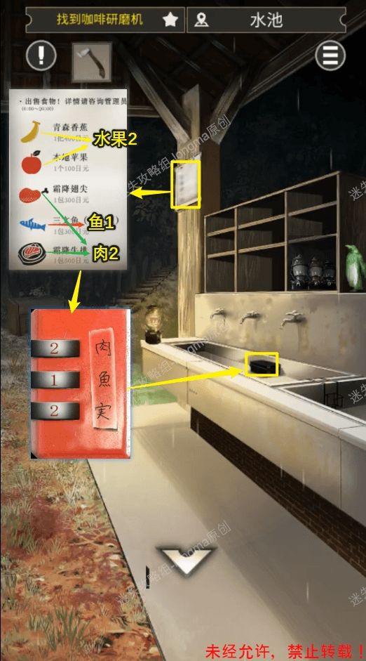 攻略作者:迷失攻略组-longma未经许可,禁止转载,侵权必究!✅STAGE 8 找到咖啡研磨机29.水池,查看柱子上的菜单,找到对应食材的数量(肉类2中、鱼类1种、水果2中),根据食材数量打开水池中的盒子,获得【把手】【纸条】。2930.水池,查看左前方的箱子,记住上面垃圾分类的图案。3031.车后方视角,对照垃圾分类图案,将【纸条】上的物品进行分类,找到对应的颜色(黄、蓝、红、红、黄