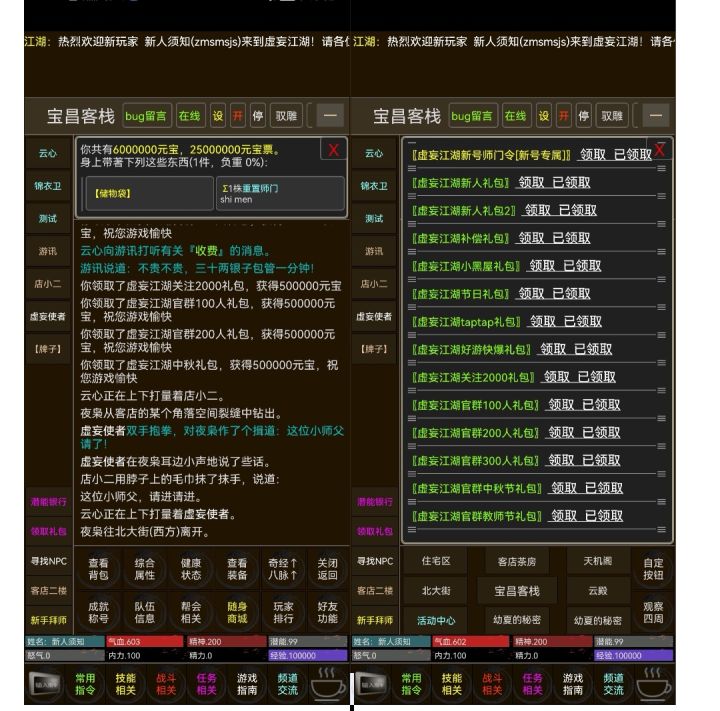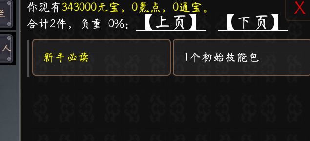 8.领副利:刚开始出生地点在树屋,先把兑换码里面的一些东西领了。如何看兑换码,先点下面按钮,里面有指南两个字,再点公告,查看信息。六个礼包共计经验5000125,潜能5000000,元宝343000。江湖阅历和威望各五千。为什么我没有基础技能?我明明领了。不要着点开包裹,使用初始技能包。