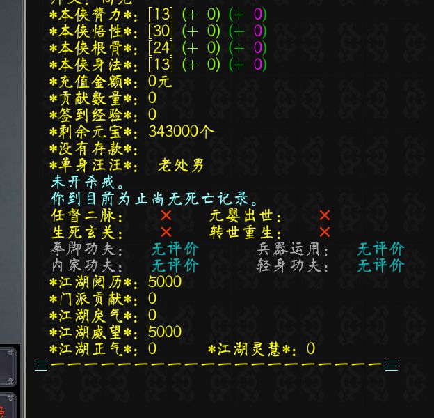 4.洗点,选自己喜欢的,有一些门派需要一些先天属性 后天属性等四种流派:①臂力流:30 13 24 13;②悟性流:13 30 24 13;③根骨流:13 24 30 13;④身法流:13 24 13 30;此外,还有一些公共武学当然大多就有归属,告诉你,白嫖别人的武学,不可能,绝对不可能。公共武学目前认为太玄功,降龙,段家六脉,武当太极图;互搏,九剑,就不用想了,归属。