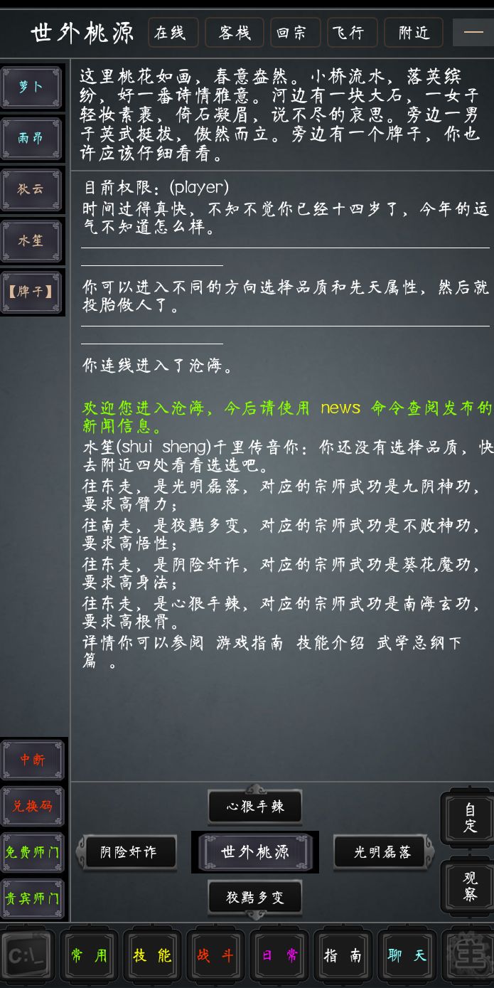 2.进入后你就会看到这样的图(世外桃源) ,接着你就可以选你喜欢的性格,光明磊落(抗打)-九阴神功,狡黠多变(使用绝招状态短一些)-不败神功,心狠手辣(杀伤力大)-南海玄功,阴险狡诈(命中高)-葵花魔功,当然你选完