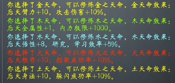 3.接下来到天命,金木水火土,你可以随便选一个按自己的喜好,有的人喜欢伤害高,选金后天臂力+10,攻击伤害+10%,有人觉得内力不够选木,后天属性+1,内力极限加1000,还有人觉得研究练习速度太慢,选水后天悟性+8,练习+5% 。当你觉得你太脆了,选火,后天根骨加+10,招架成功率加10%(武当狂喜)。你想要别人打不着你选土,后天身法+10,射闪成功率+10%(葵花狂喜)。
