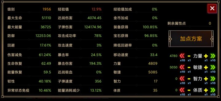每升1级,获得10点生命、5点能量和5个属性点。每点力量提升1%近战伤害和3点生命,每点敏捷提升0.5%远程伤害和1点防御力,每点智力提升1%能量,每点体质提升1%血量。部分技能和效果受到各项属性的加成。射击类技能或远程武器是子弹伤害,子弹伤害无法暴击,但是可以命中弱点,暴击和爆伤都可加成弱点伤害。
