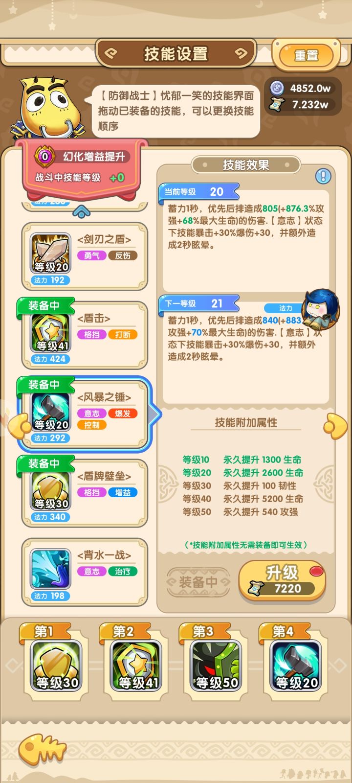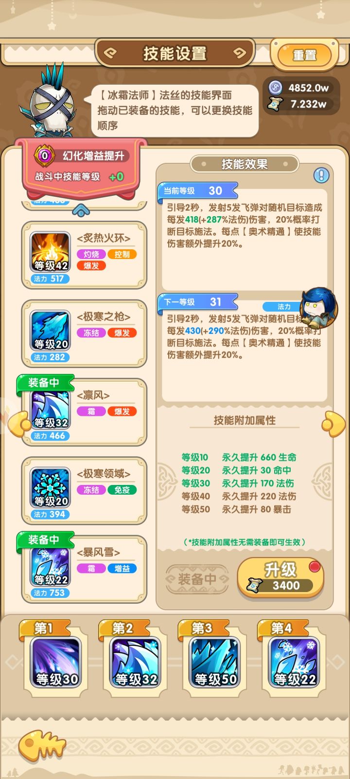 除了要用的技能升级,其他的先把低级技能升满收益比较大,目前打到23章了