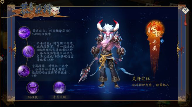 牛头这个英雄的技能简直完美,必杀技2段控制技能,这个技能经过实际测试,高几率会打断对面1至2个英雄的必杀,到超凡后必杀还可以回复一定血量。再看看专属技能【插翅难逃】,这是牛头最恐怖的地方。这个技能开局就拉敌方中后排随机一个英雄单位。也就是说他拉过来的都不会太肉,甚至于会把奶妈拉到前面来锤。配合大招的2段控制以及后排的输出对面奶妈基本就没了(被拉的英雄还会受到控制和降低治疗效果)。再来看被动技能