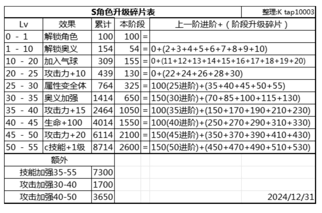 S角色碎片需求表