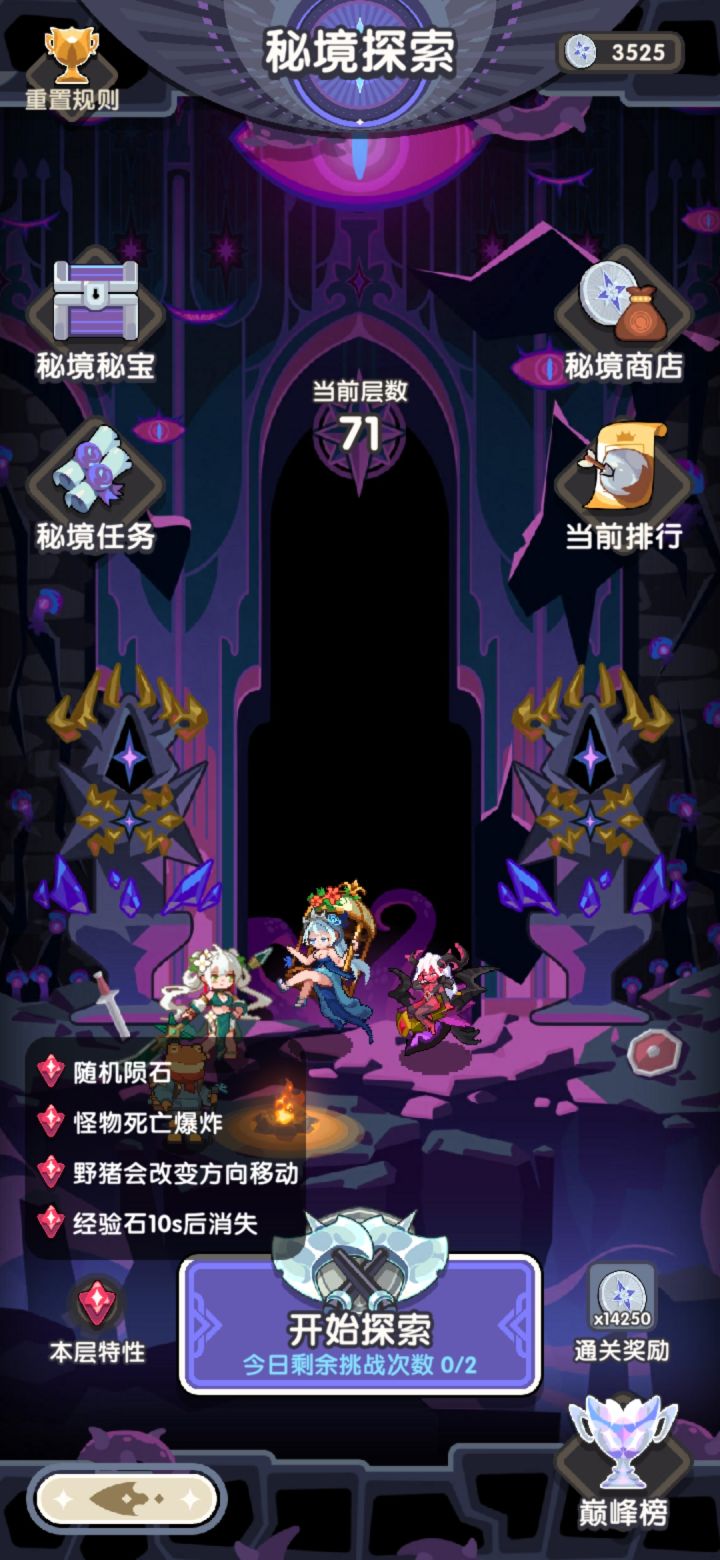 卡关流,5344功,热气球第三技能还没开,技能封剩3个,只有两张S卡,开局觉醒还得靠红蓝骰子或者运气别太差,到这次秘境的62层真的是燃尽了,不得不说血量增加之后再翻倍的秘境真的是太考验攻击力了。反正开始领低保了,闲来没事分享一下卡关流的心得吧,战绩镇楼。以下攻略面对新手,万攻大佬请跳过。卡关流,指的是主线卡关,推到第25关就不推了,然后送的封印石就能把所有主线开出来的技能全封了,只剩下主英雄