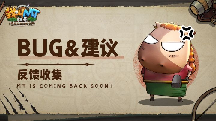 致各位勇士:《我叫MT:归来》「启航测试」将于8月23日10:00正式开启!昔日的伙伴再度归来,新的冒险也即将开始,各位勇士们,快随哀木涕、傻馒等熟悉的角色一起,征战艾泽大陆吧!为了快速响应并解决勇士们在游戏过程中遇到的问题,提供更为良好的游戏体验,小花专门开出了本条反馈帖,来收集勇士们在冒险中遇到的BUG,或是对于游戏的建议~小花会会认真听取,并及时汇总给项目组,还请各位勇士多多包容!问