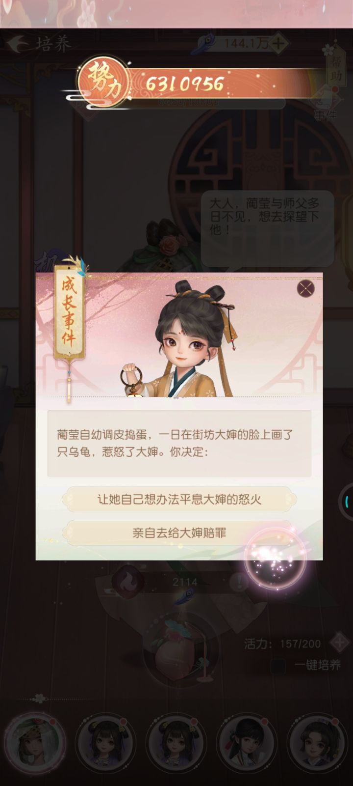 徒弟培养会因为点了不同选项把孩子培养成不同方向。还有好几十个不同的职业小故事。徒弟毕业之后有的时候还会给女主写几十字小短信!特别有成就感!