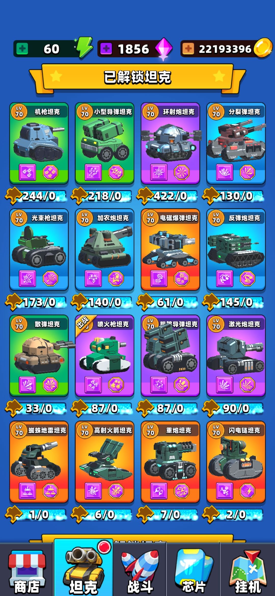 满了满了,所有坦克都满了。就慢慢升级芯片了。最好用坦克:1档:喷火坦克、闪电链坦克 2档:激光坦克、蜘蛛地雷坦克、电磁爆弹坦克、重炮坦克 3档:高射火箭坦克、跟踪导弹坦克。1档最好用、2档比较依赖芯片。 3档依赖芯片+运气。其他坦克就呵呵了[表情_斜眼笑]#游戏日常