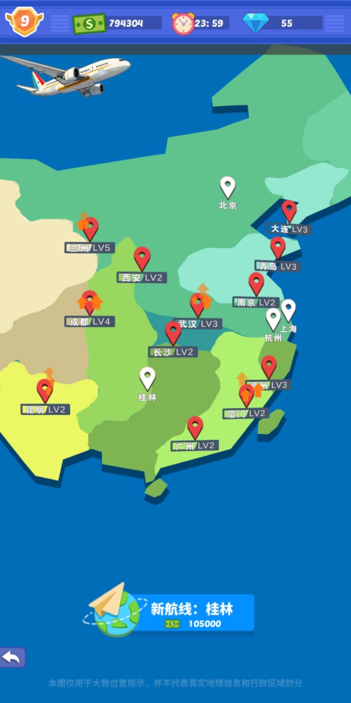 玩了三天,15级,还有三个城市没满5级,只要有时间肯看广告,一天就能封顶。下面说说玩的问题吧,听说策划就一人,能看到的话考虑考虑选择优化优化。1.探索,太磨叽,一个城市几百点探索,要一个一个来,费劲;2.餐食研发时间确实太长了,越高级的餐食,制造越赶不上食用,需要双倍,四条生产线也不够用;3.工作人员薪资封顶后只能用钻石恢复心情,而且一个航班只有一位机长和空姐,不符合逻辑;4.航线设备升级