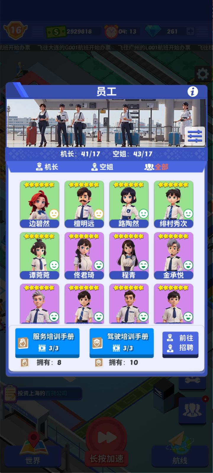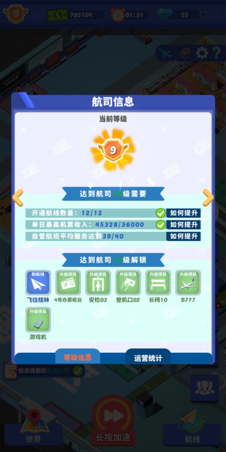 玩了3天,想必玩过的玩家也都知道主要的收益源自于广告。但也不是全部需要。因为当你开通9条线以后资金基本不会不够用,可是会被升级任务卡住,我不知各位是否和我一样卡在了航班服务上。这个我有一点没看懂,就是我让空姐培训一次是增加其本身能力的倍数。但是在任务里就只加了1点(原本空姐魅力5既服务初始为5,培训一次魅力+5既服务+5),招募的时候是不是一定要尽可能多用自身点数高一些的人员能缓解这个问题。以下