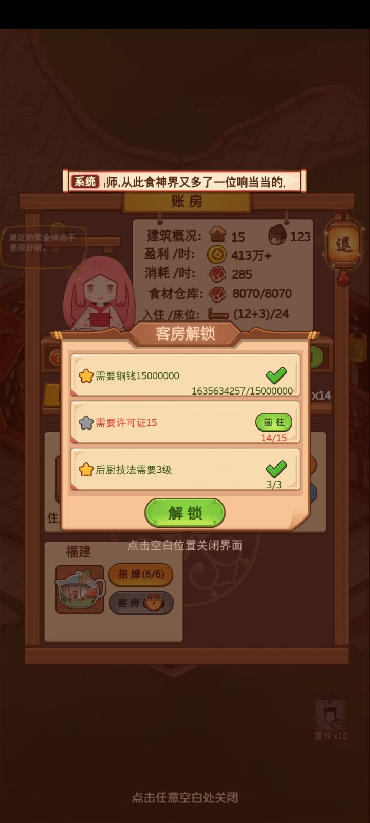 客房也是升级的一种途径要开通客房首先得有相应的住宿经营许可证(玩家一般简称为许可证),通过集齐一个店铺的菜可以获得一个,也可以通过开好人卡随机获得,还可以通过集齐五个农宠图鉴、鲜花榜第一或护花榜第一都分别可以获得一个许可证,如下图所示即位开一个地方的铺子所需接下来就是如何升级客房了,如下图,未装修就和最后面两个一样,客房的等级从低到高是马圈、柴房、通铺。升级到不同等级时是需要不同的铁木石、琥