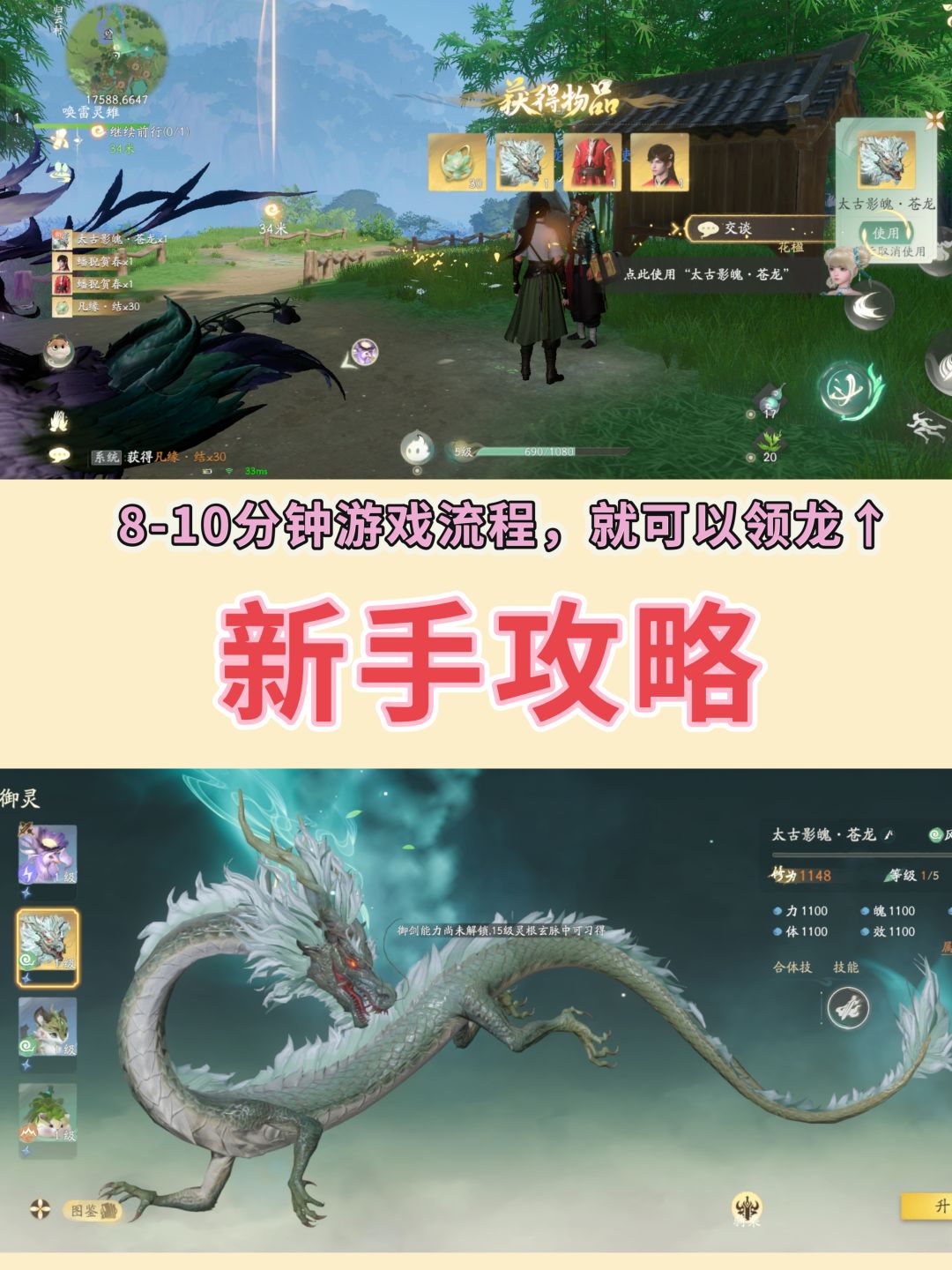 前言:经过一天的开荒,附上新手攻略 没有领龙+30抽的,直接翻 图2 ➤目录: ①预约奖励领取 ②配队+御灵 ③小小技巧 ————————正文——————— ➣①奖励领取 ⒈新手8-10分钟,村外找『八荒客』 ⒉流程20-30分钟,过完第一个副本 吃一下家园『灵果』 10级→发预约邮件 ⒊多端登录,下个云端 领前期很搭配主角的御灵+600灵石 ➣②配队+御灵 抽完预约奖励→1-2个