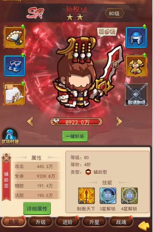 大家好呀,今天由我来给大家介绍游戏的重要养成系统—神兵系统。神兵系统由升星、连携及进阶组成,每个部分的养成都会对武将属性带来一定的提升,并且激活更为强大的神兵技能。不同的神兵其技能也各不相同,双铁戟可对敌方前排造成伤害并有概率降低敌方防御;济世葫可对敌方随机三个目标造成伤害并为我方生命最低单位恢复生命; 青釭剑可对敌方后排造成伤害并降低敌方伤害; 虎头湛金枪可对敌方全体造成伤害并有概率眩