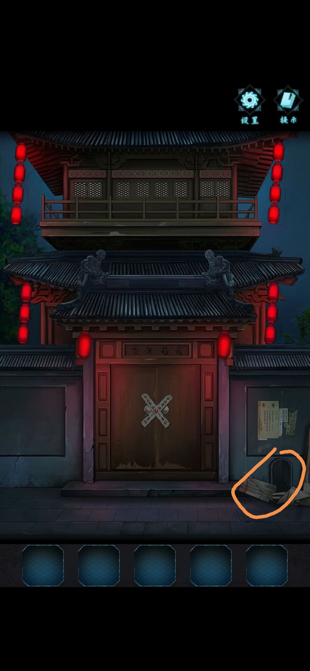 第五章:旧尘缘 1.(走廊)点击窗户,点击对面圆形的东西,对风铃使用【红纸】,获得线索(风铃响的顺序:换、日、须、臾、偷、天) 2.点击右边房间门上的锁,根据风铃响的顺序(换、日、须、臾、偷、天),调整密码锁(要看中间的十字符号,看字在符号的哪个位置:就比如换在十字符号上方),打开门 3.(右边房间)点击查看地上的书 4.点击墙上的机关,查看游戏说明,完成小游戏 5.暗格打开,获得【黑布】和【手鼓