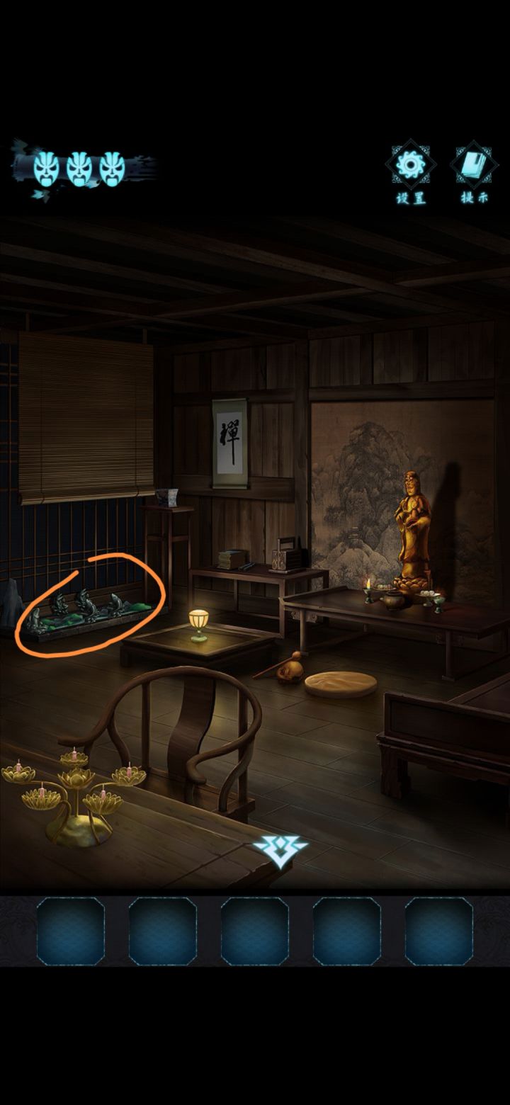 第五章点击图中位置接通水管,得到种子往盆栽中种入种子,得到提示点击图中位置得到关于鸟的提示和蜡烛草用灯点燃蜡烛草,然后按顺序提示点击桌上的花,打开机关得到钥匙用钥匙打开第二扇房间门点击桌上的扇子,掀开后得到钥匙,用钥匙打开盒子,得到木鸟和琴弦用木鸟触发图中机关,得到月亮的提示点击柜子上方,根据月亮的提示调整各个鸟的位置,打开下面的柜子得到红色的纸点击窗户,对着窗户对面的一堆铃铛用
