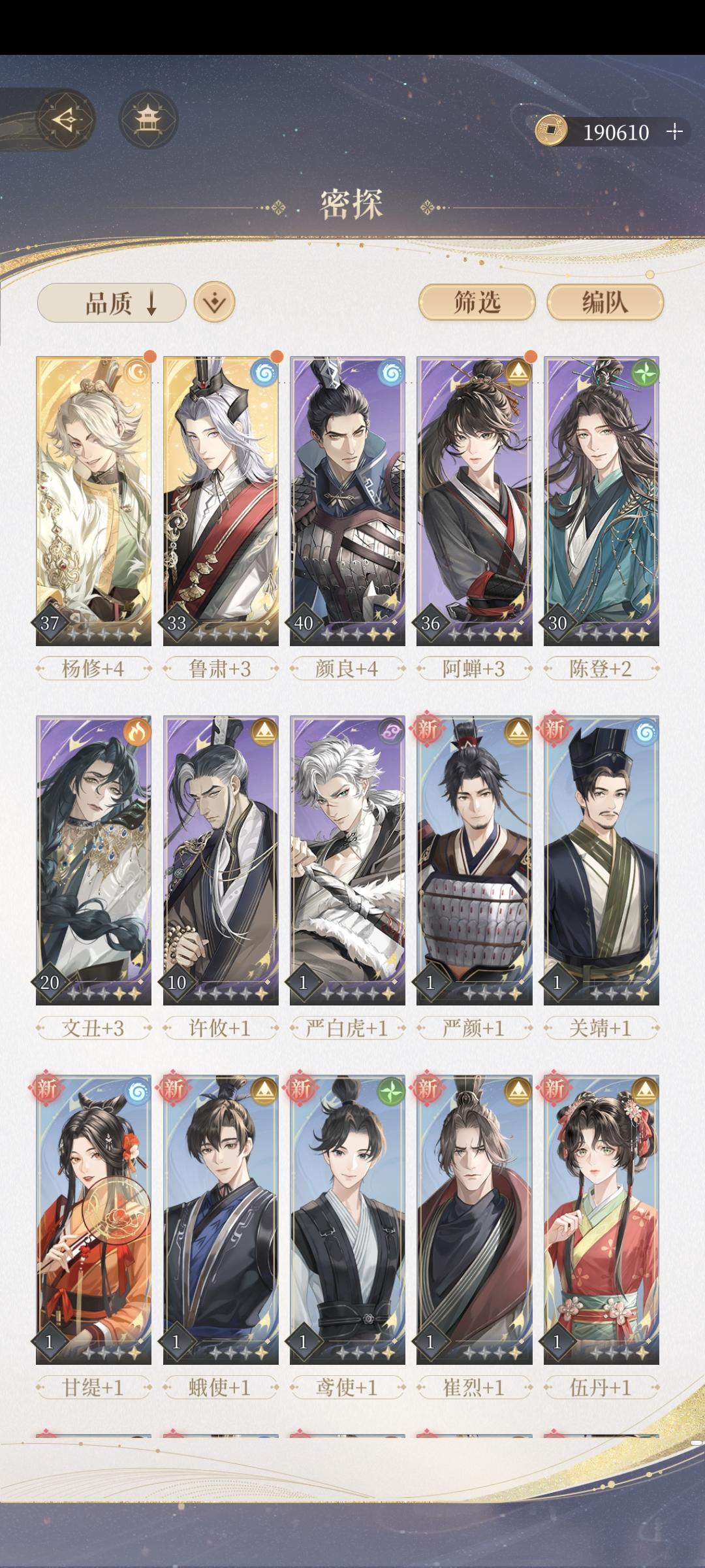 推兰台超级快,一般两回合结束。 有郭嘉贾诩的可以练起来~陈登当队长拉条,一定要抢在三回合内团灭对面。 阿婵上场,作为收割,一下子能收三四个哈。 不一定要带奶妈,这个阵容不需要盾,因为两三回合就结束啦。当然,过不了BOSS关,打打小怪还是很快的。比修子好用一些。