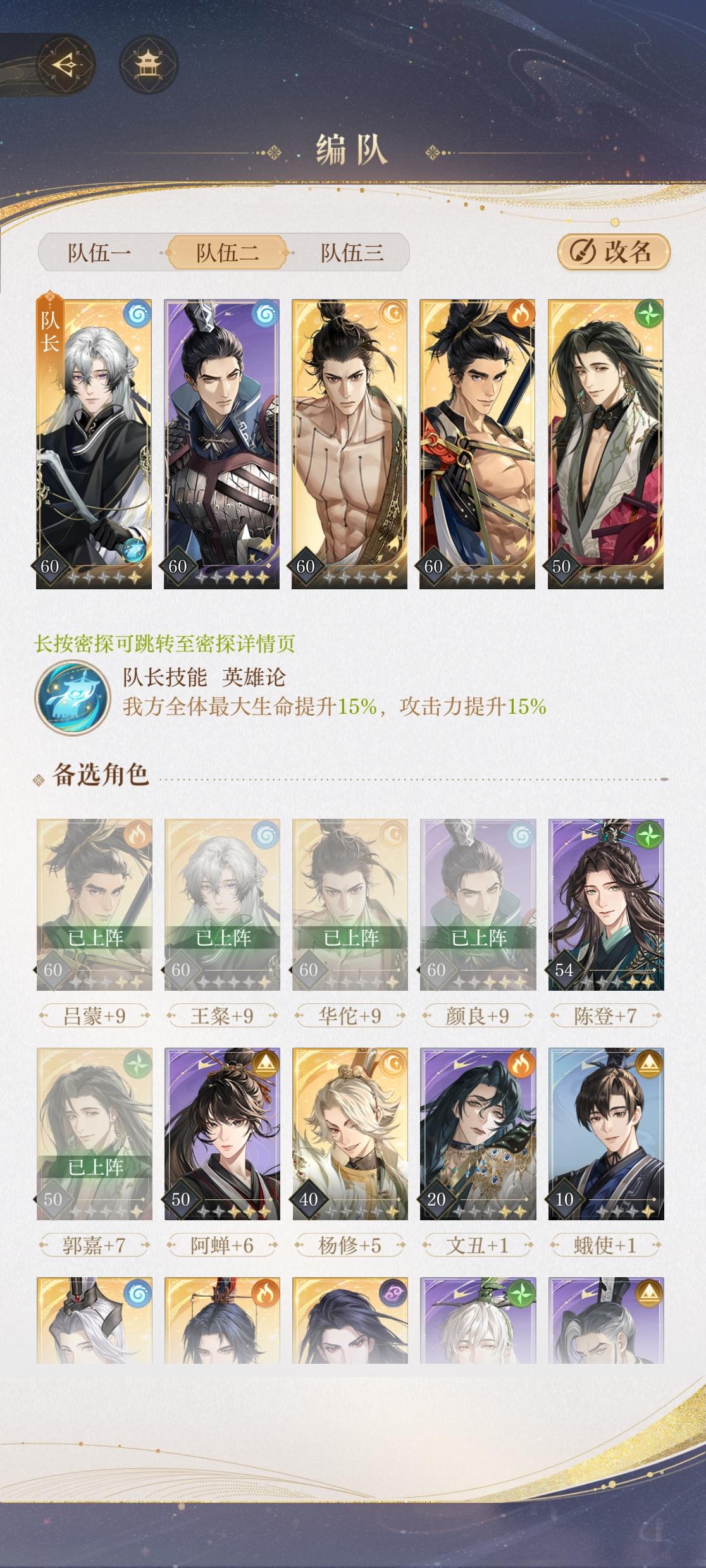 练度参考:全员60+9,一星香香,三星吕蒙,三星孙权,三星颜良,一星郭解,主要是要赌香香的暴击和吕蒙小红莲[表情_微笑]