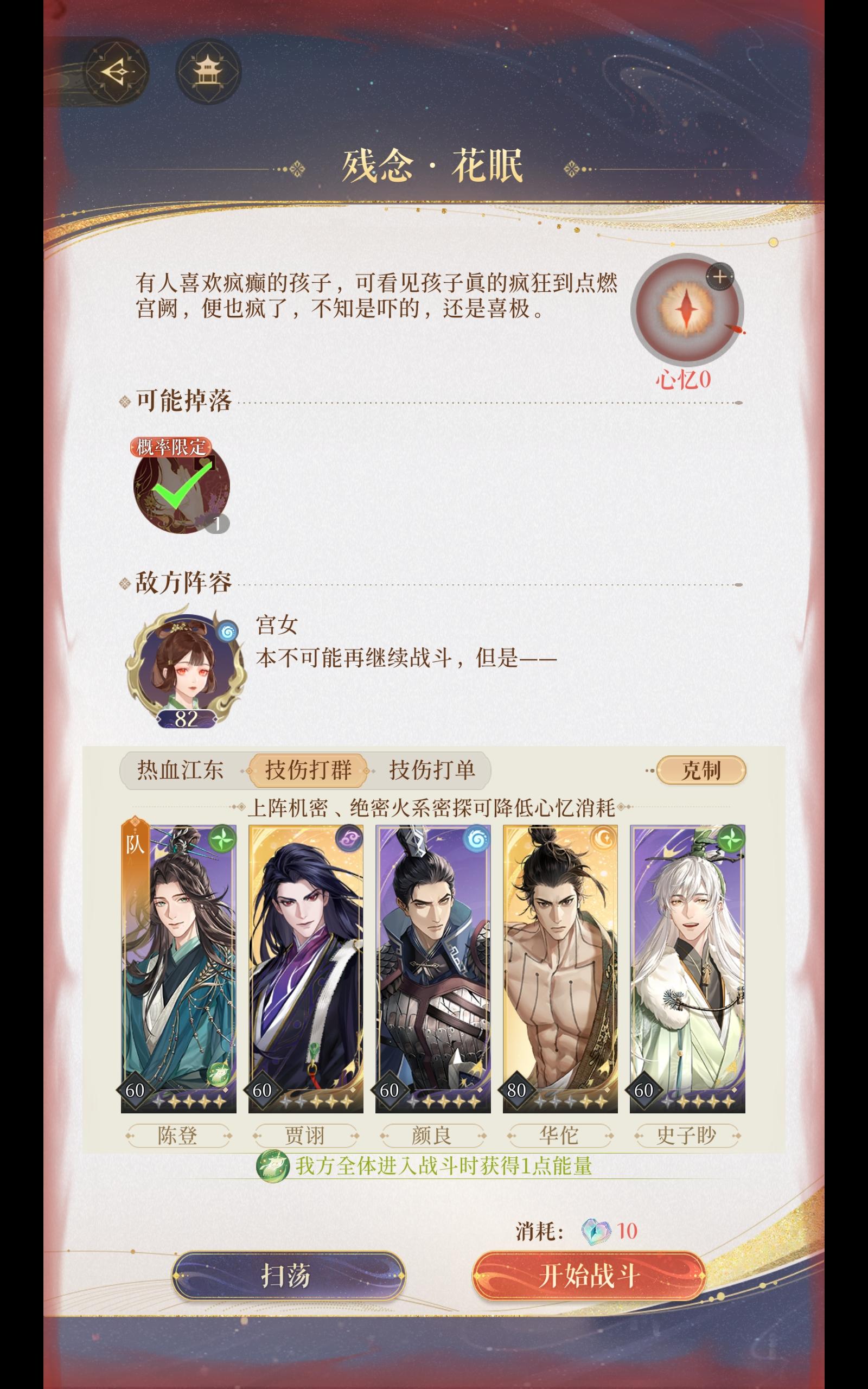 感觉也不算什么很有借鉴性的攻略🤣 总之就是 回一陈登和颜良开大 其他人防御 保一下华佗的状态 回二 贾诩 史子眇先放大,奶华佗到满血,华佗放大 我这里是还剩2个5k血小怪 回三回四 普攻收工 这个也能打其他大部分小怪关 但是只能打单体怪+2/3个宫女的 全是宫女或者小红帽的扛不住,还有那种血量7 8w+的血量的小怪也不行(华佗高叠应该可以)
