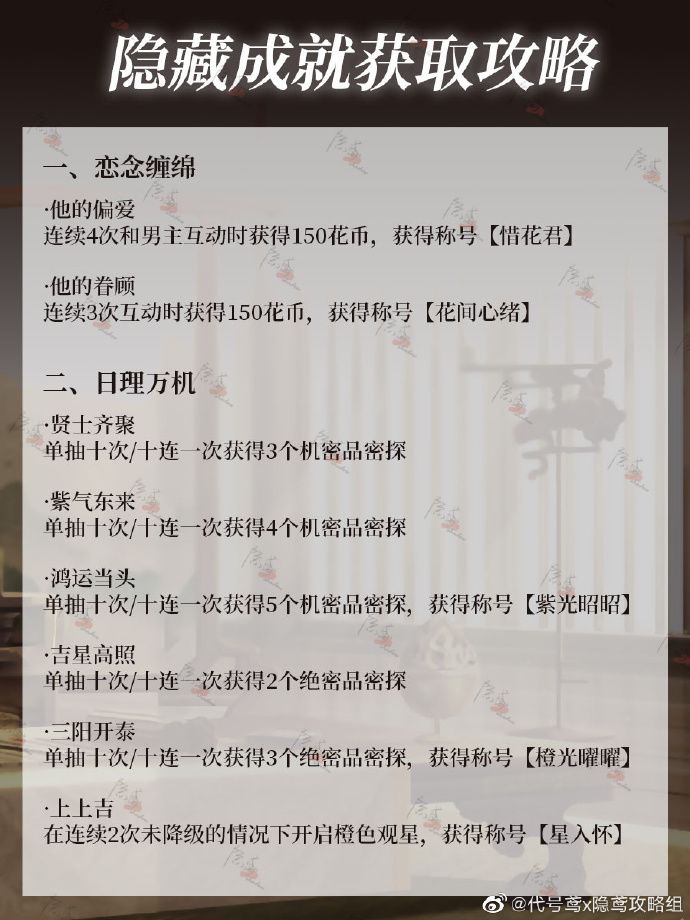 【代号鸢隐藏成就、称号攻略】 ⚠️完成隐藏成就可获得8个常驻符传[打call][打call]还有隐藏称号可获得,快快码起来[送花花][送花花][送花花] ●其他男主也有隐藏成就不过攻略组未触发,后续触发了再补上。 ●称号【挥金】因为没有确定称号获取方式,所以暂时没有录入进去,等后续触发了会更新进去的。(猜一手,可能跟观星有关 此功略搬运于微博:代号鸢x隐鸢攻略组,感谢大神分享!!#攻略#游戏讨论